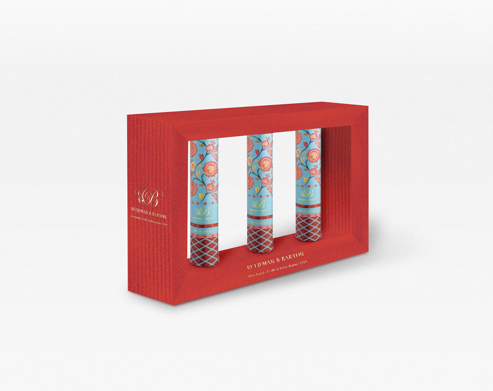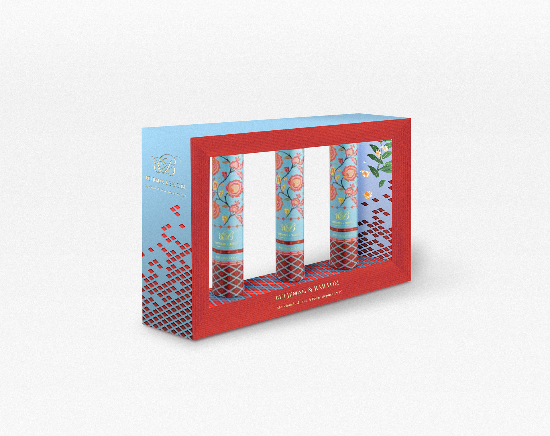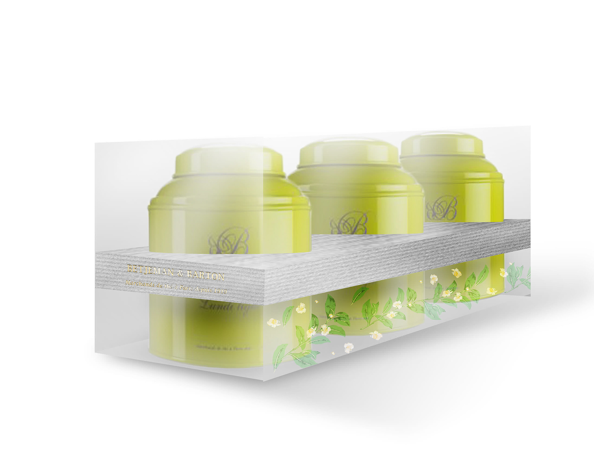 Betjeman & Barton est une marque de thé parisienne, elle avait le besoin de faire des coffrets de plusieurs boîtes pour les fêtes. Propositions : Deux pistes principales avec des déclinaisons, principalement un jeu de transparence et de graphisme.