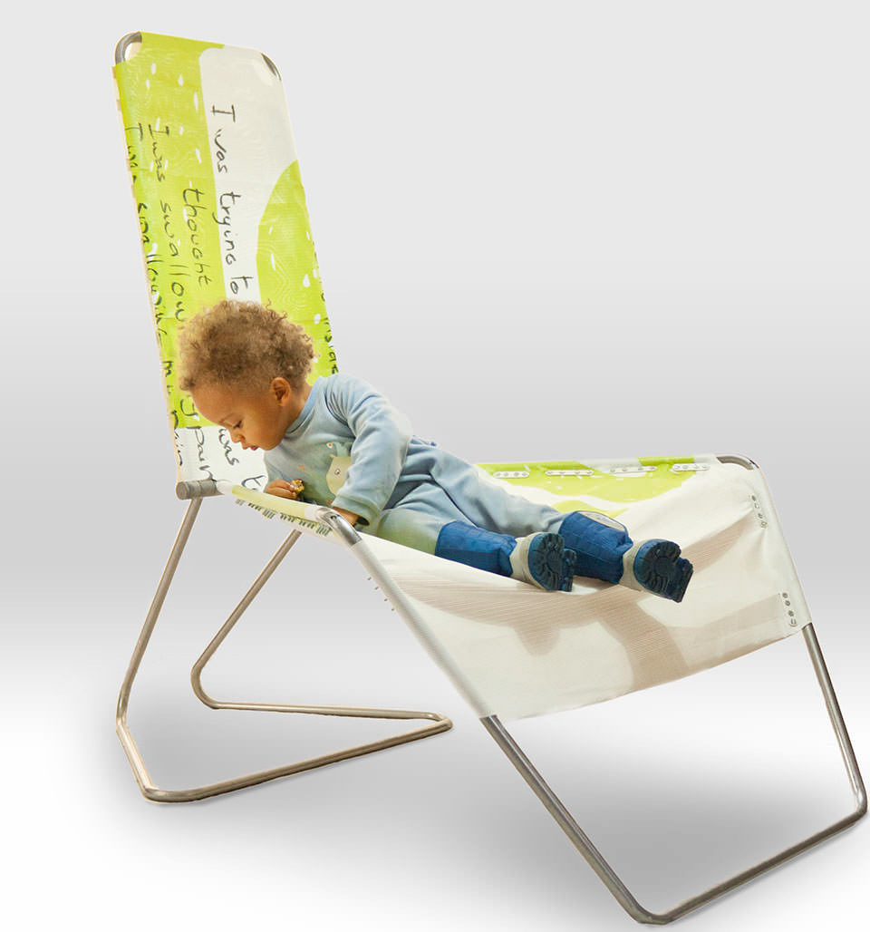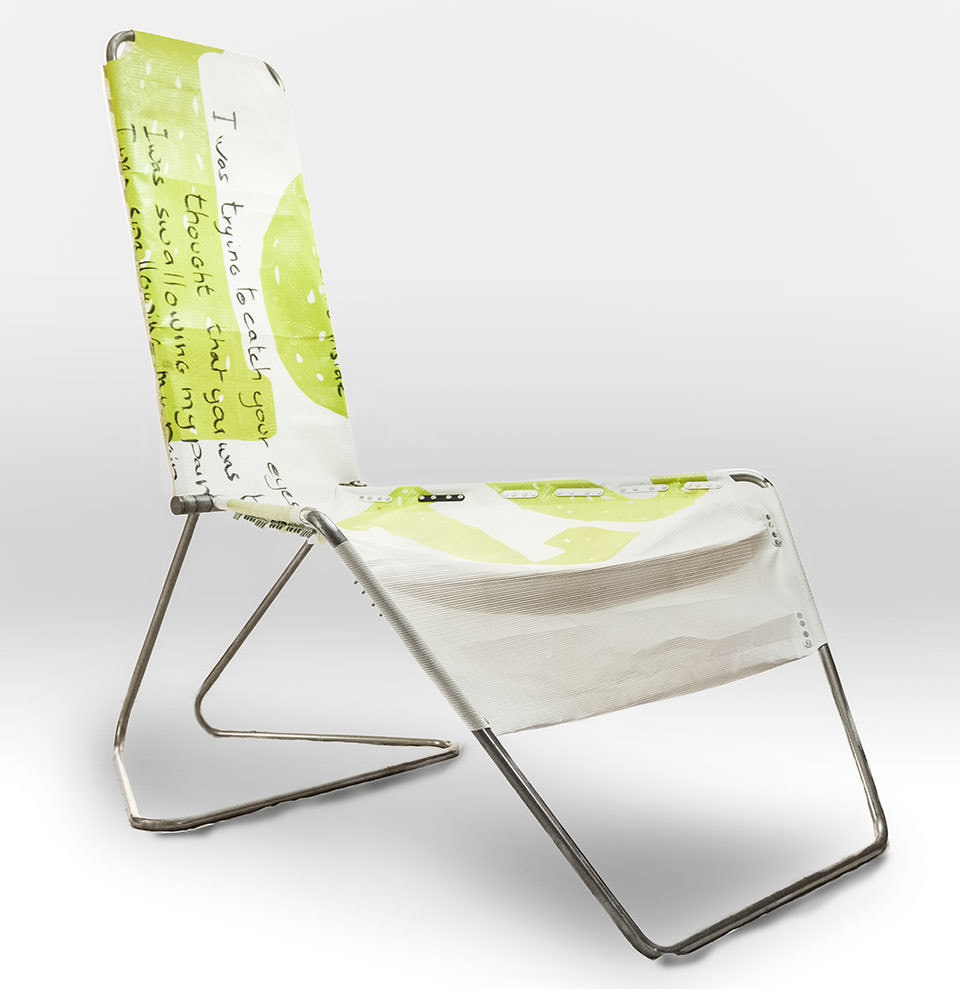 Prototype d'une chaise cosy et confortable, fait de tube d'acier et de bâche de chantier, parti d'une construction de types fil de fer, Un axe centrale réuni les trois pièces en tube d'acier, l'assise est large.